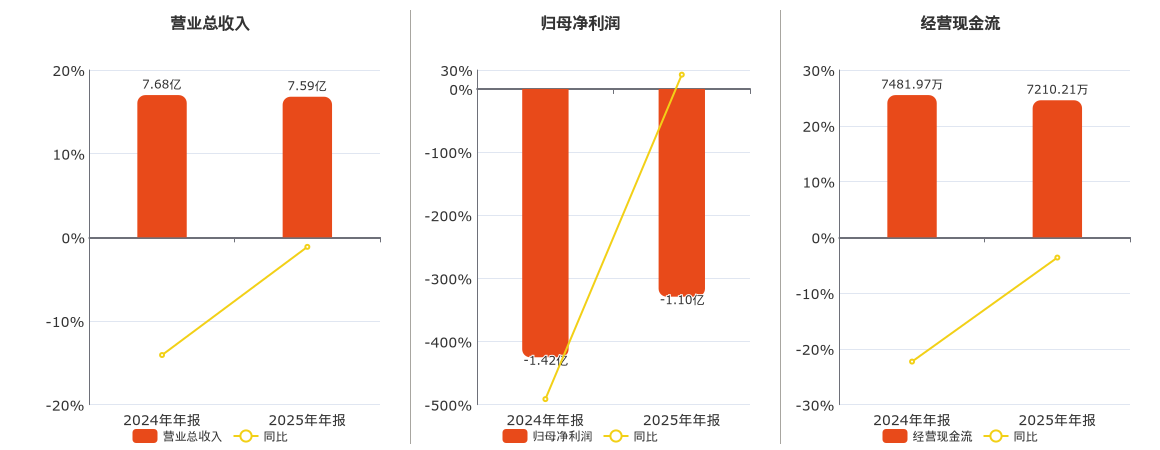 公司营业总收入为7.59亿元,较去年同报告期营业总收入减少877.42万元,同比较去年同期下降1.14%。归母净利润为-1.10亿元。经营活动现金净流入为7210.21万元,较去年同报告期经营活动现金净流入减少271.76万元,同比较去年同期下降3.63%。