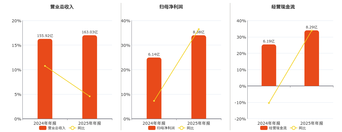 公司营业总收入为163.03亿元。归母净利润为8.38亿元。经营活动现金净流入为8.29亿元。