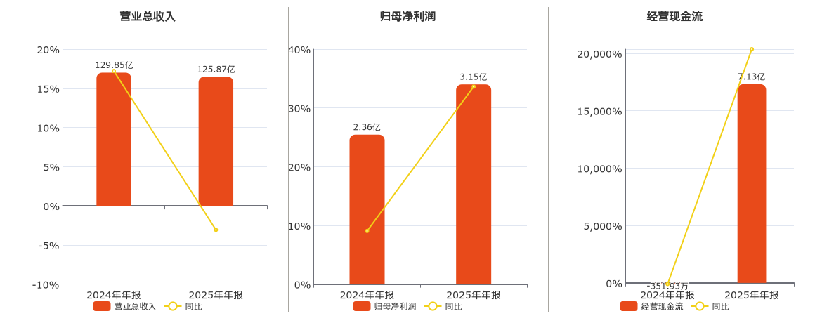 公司营业总收入为125.87亿元,较去年同报告期营业总收入减少3.99亿元,同比较去年同期下降3.07%。归母净利润为3.15亿元。经营活动现金净流入为7.13亿元。