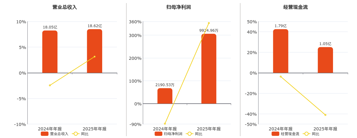 公司营业总收入为18.62亿元,在已披露的同业公司中排名第6。归母净利润为9924.96万元。经营活动现金净流入为1.05亿元,在已披露的同业公司中排名第6,较去年同报告期经营活动现金净流入减少7335.64万元,同比较去年同期下降41.09%。