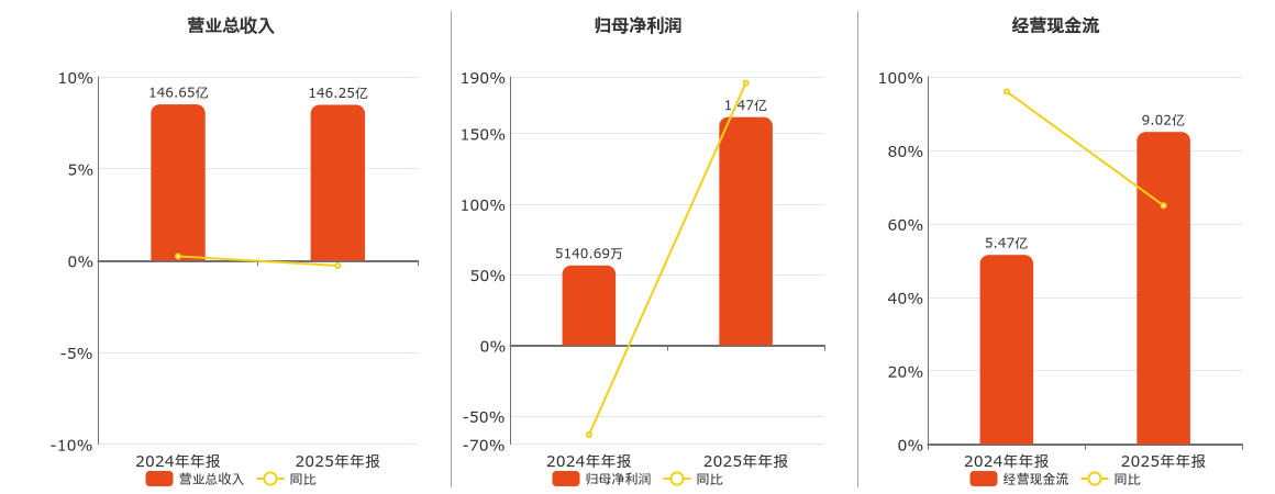 公司营业总收入为146.25亿元,较去年同报告期营业总收入减少4077.10万元,同比较去年同期下降0.28%。归母净利润为1.47亿元。经营活动现金净流入为9.02亿元。