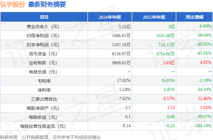 据证券之星公开数据整理,近期弘宇股份(002890)发布2025年年报。截至本报告期末,公司营业总收入3.0亿元,同比下降6.89%,归母净利润1035.08万元,同比下降38.64%。按单季度数据看,第四季度营业总收入5625.16万元,同比下降14.61%,第四季度归母净利润-154.8万元,同比下降150.12%。本报告期弘宇股份公司应收账款体量较大,当期应收账款占最新年报归母净利润比达994.2%。