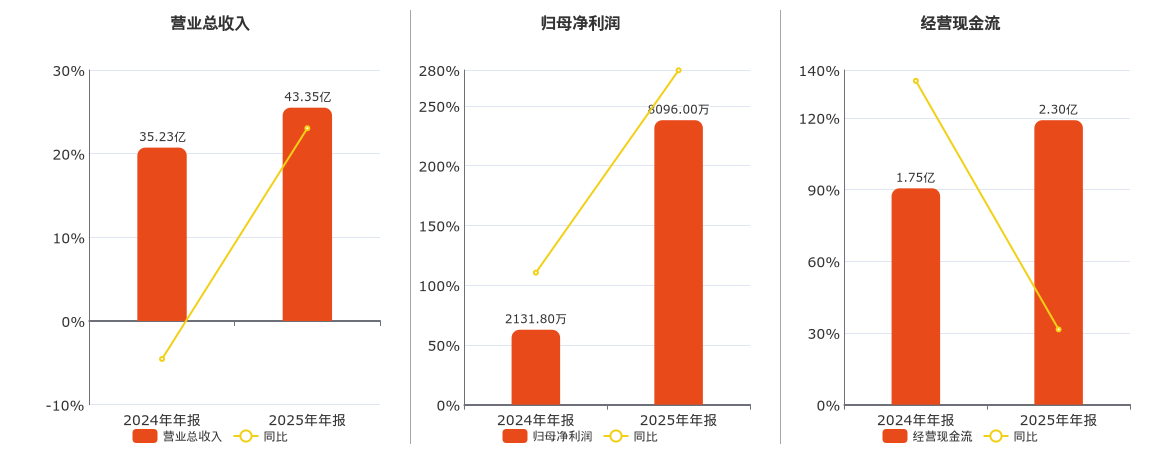 公司营业总收入为43.35亿元。归母净利润为8096.00万元。经营活动现金净流入为2.30亿元。