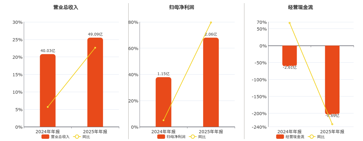 公司营业总收入为49.09亿元,在已披露的同业公司中排名第9。归母净利润为2.06亿元,在已披露的同业公司中排名第9。经营活动现金净流入为-8.69亿元,在已披露的同业公司中排名第17,较去年同报告期经营活动现金净流入减少6.07亿元。
