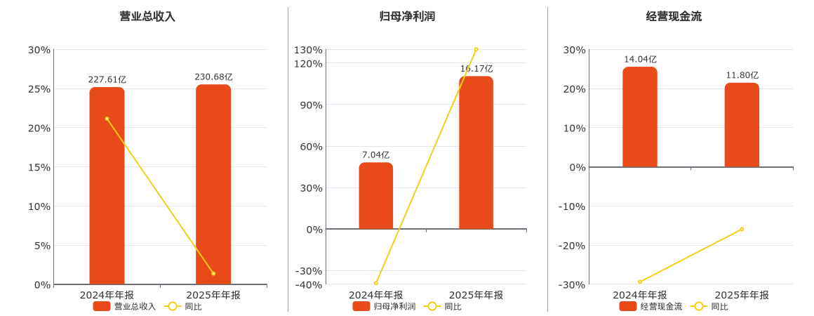 公司营业总收入为230.68亿元,在已披露的同业公司中排名第17。归母净利润为16.17亿元。经营活动现金净流入为11.80亿元,较去年同报告期经营活动现金净流入减少2.24亿元,同比较去年同期下降15.96%。