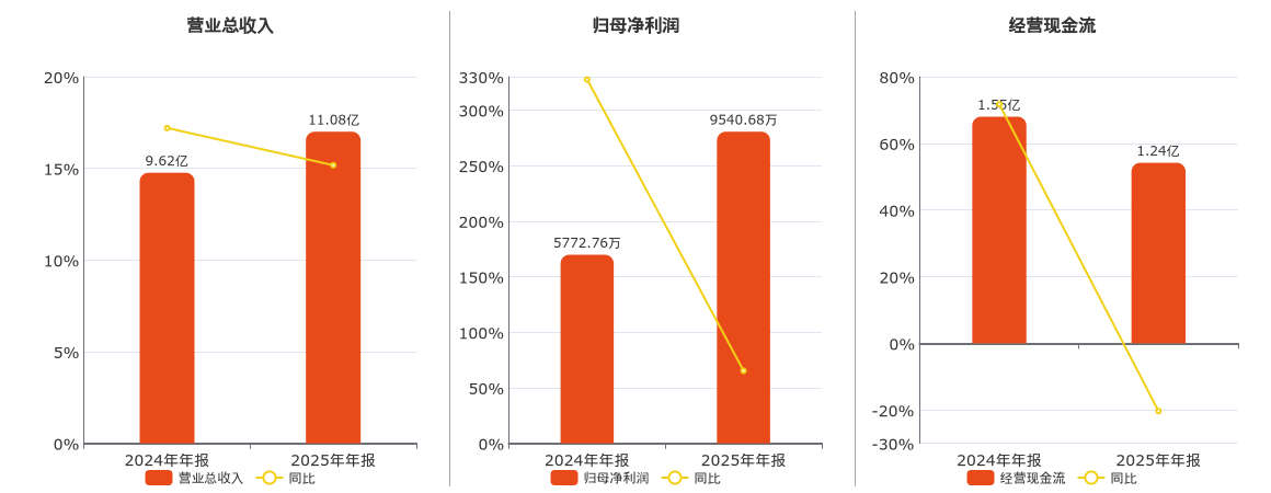 公司营业总收入为11.08亿元,在已披露的同业公司中排名第30。归母净利润为9540.68万元,在已披露的同业公司中排名第18。经营活动现金净流入为1.24亿元,在已披露的同业公司中排名第24,较去年同报告期经营活动现金净流入减少3160.52万元,同比较去年同期下降20.34%。