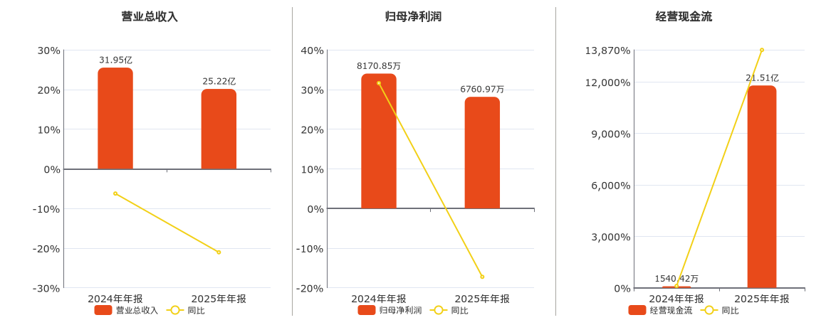 公司营业总收入为25.22亿元,在已披露的同业公司中排名第30,较去年同报告期营业总收入减少6.73亿元,同比较去年同期下降21.06%。归母净利润为6760.97万元,在已披露的同业公司中排名第19,较去年同报告期归母净利润减少1409.87万元,同比较去年同期下降17.25%。经营活动现金净流入为21.51亿元,在已披露的同业公司中排名第6,较去年同报告期经营活动现金净流入增加21.35亿元,实现2年连续上涨,同比较去年同期上涨1.39万%。