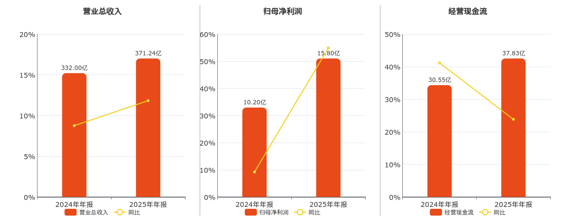 公司营业总收入为371.24亿元。归母净利润为15.80亿元。经营活动现金净流入为37.83亿元。
