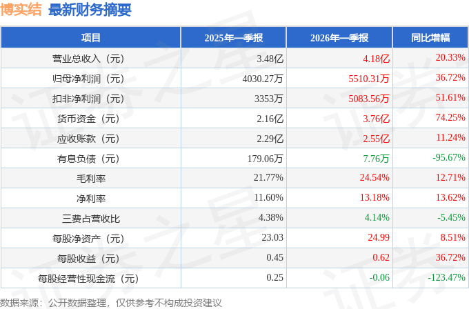 据证券之星公开数据整理,近期博实结(301608)发布2026年一季报。截至本报告期末,公司营业总收入4.18亿元,同比上升20.33%,归母净利润5510.31万元,同比上升36.72%。按单季度数据看,第一季度营业总收入4.18亿元,同比上升20.33%,第一季度归母净利润5510.31万元,同比上升36.72%。本报告期博实结盈利能力上升,毛利率同比增幅12.71%,净利率同比增幅13.62%。