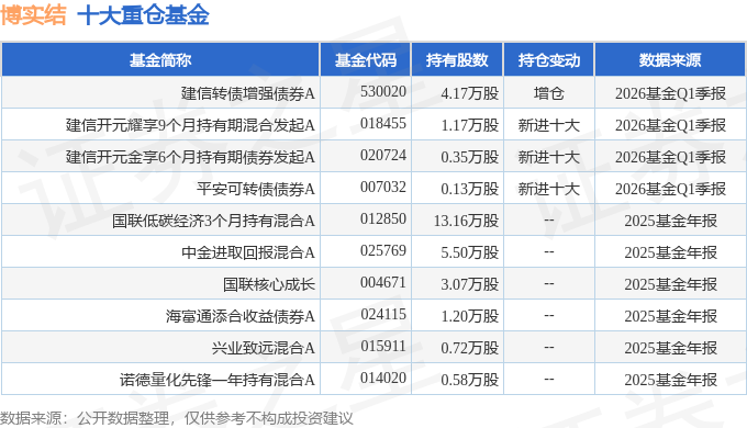 持有博实结最多的基金为建信转债增强债券A,目前规模为1.21亿元,最新净值3.927(4月21日),较上一交易日下跌0.3%,近一年上涨29.43%。该基金现任基金经理为吕怡 赵荣杰。