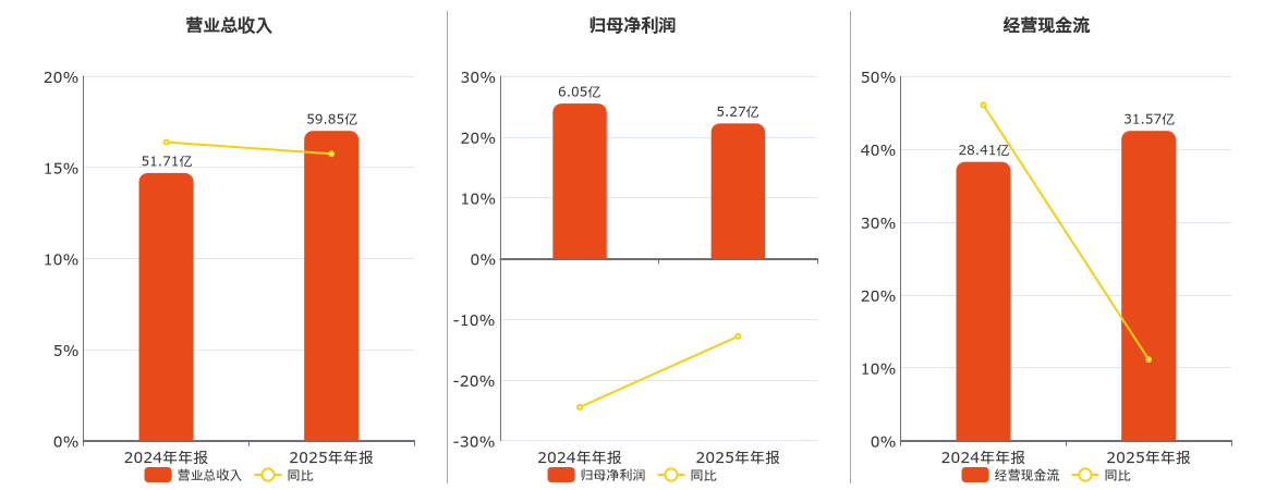 公司营业总收入为59.85亿元,在已披露的同业公司中排名第3,较去年同报告期营业总收入增加8.14亿元,实现5年连续上涨,同比较去年同期上涨15.74%。归母净利润为5.27亿元,在已披露的同业公司中排名第6,较去年同报告期归母净利润减少7757.06万元,同比较去年同期下降12.83%。经营活动现金净流入为31.57亿元,在已披露的同业公司中排名第3,较去年同报告期经营活动现金净流入增加3.16亿元,实现5年连续上涨,同比较去年同期上涨11.13%。