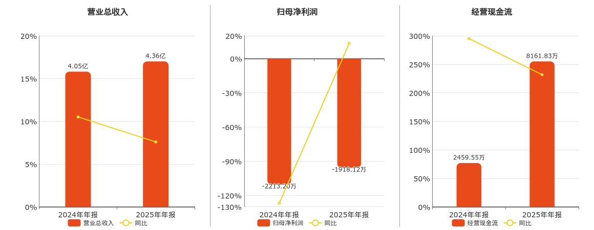公司营业总收入为4.36亿元。归母净利润为-1918.12万元。经营活动现金净流入为8161.83万元。