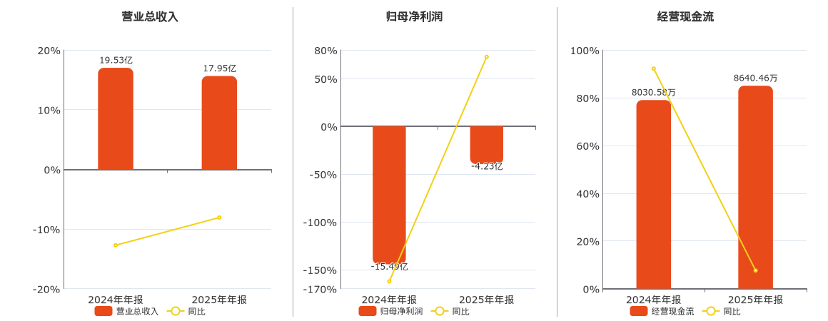 公司营业总收入为17.95亿元,较去年同报告期营业总收入减少1.58亿元,同比较去年同期下降8.08%。归母净利润为-4.23亿元。经营活动现金净流入为8640.46万元。