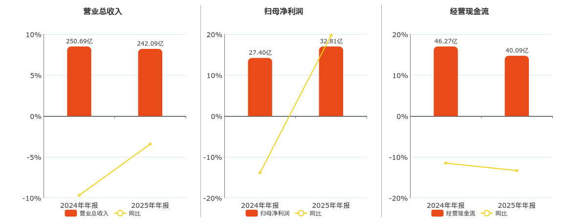 公司营业总收入为242.09亿元,较去年同报告期营业总收入减少8.61亿元,同比较去年同期下降3.43%。归母净利润为32.81亿元。经营活动现金净流入为40.09亿元,较去年同报告期经营活动现金净流入减少6.17亿元,同比较去年同期下降13.35%。