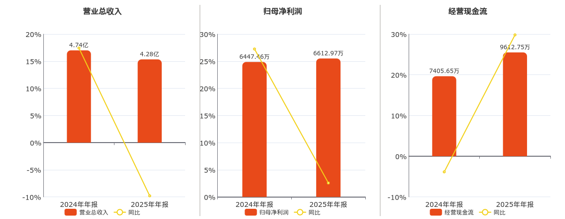 公司营业总收入为4.28亿元,较去年同报告期营业总收入减少4648.55万元,同比较去年同期下降9.80%。归母净利润为6612.97万元。经营活动现金净流入为9612.75万元。