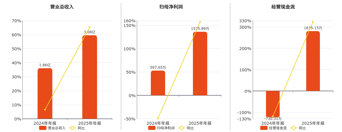 公司营业总收入为3.08亿元。归母净利润为1535.89万元。经营活动现金净流入为1635.15万元。