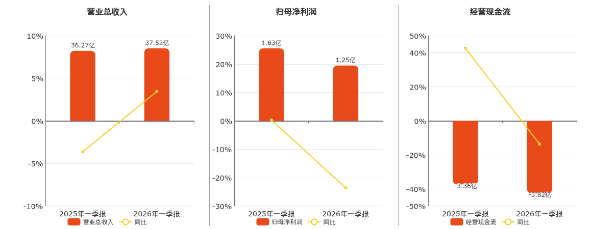公司营业总收入为37.52亿元,较去年同报告期营业总收入增加1.25亿元,同比较去年同期上涨3.44%。归母净利润为1.25亿元,较去年同报告期归母净利润减少3859.71万元,同比较去年同期下降23.64%。经营活动现金净流入为-3.82亿元,较去年同报告期经营活动现金净流入减少4602.43万元。