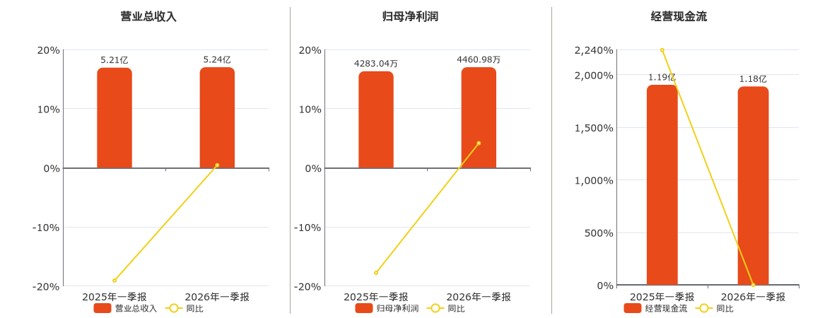 公司营业总收入为5.24亿元。归母净利润为4460.98万元。经营活动现金净流入为1.18亿元,较去年同报告期经营活动现金净流入减少99.78万元,同比较去年同期下降0.84%。