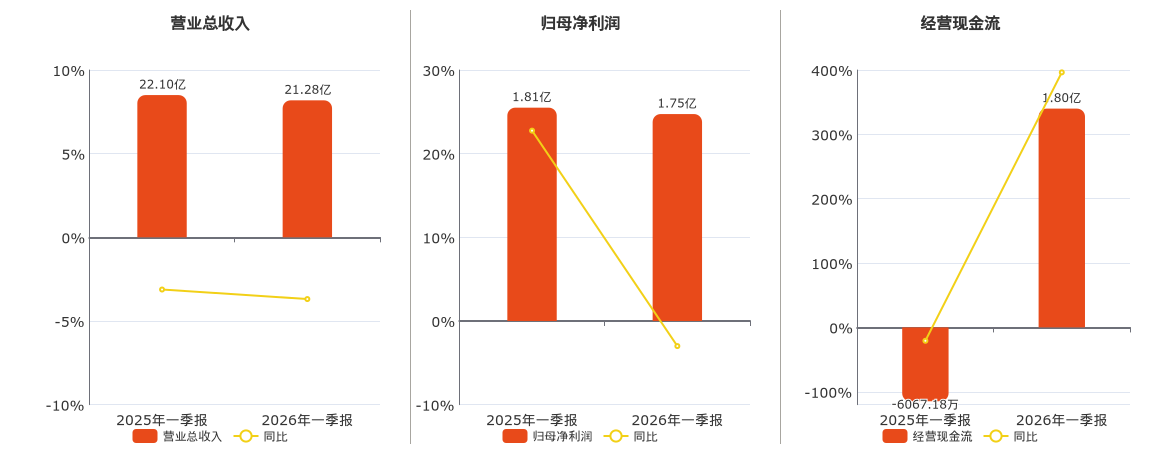 公司营业总收入为21.28亿元,较去年同报告期营业总收入减少8150.19万元,同比较去年同期下降3.69%。归母净利润为1.75亿元,较去年同报告期归母净利润减少542.04万元,同比较去年同期下降3.00%。经营活动现金净流入为1.80亿元,较去年同报告期经营活动现金净流入增加2.40亿元。