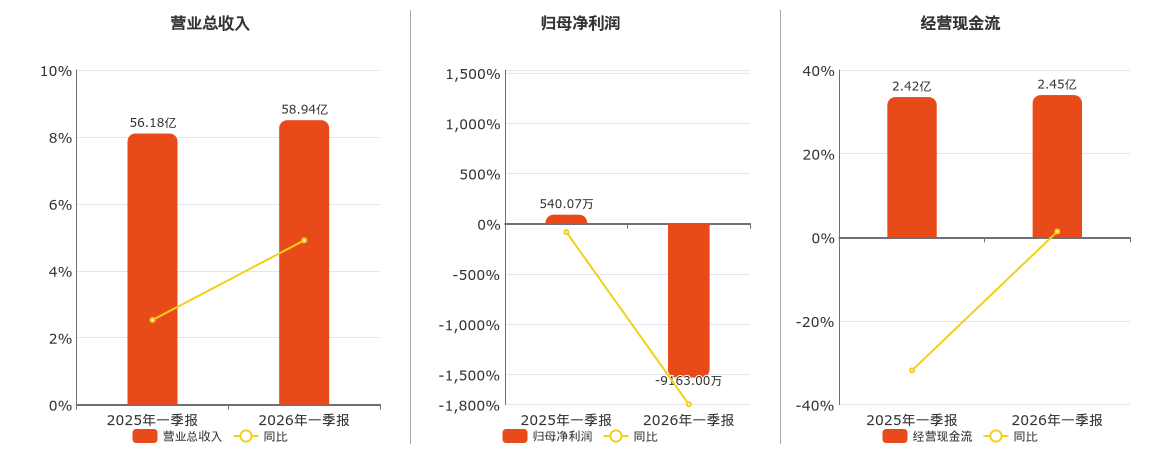 公司营业总收入为58.94亿元,较去年同报告期营业总收入增加2.76亿元,实现2年连续上涨,同比较去年同期上涨4.91%。归母净利润为-9163.00万元,较去年同报告期归母净利润减少9703.08万元,同比较去年同期下降1796.62%。经营活动现金净流入为2.45亿元,较去年同报告期经营活动现金净流入增加338.10万元,同比较去年同期上涨1.40%。