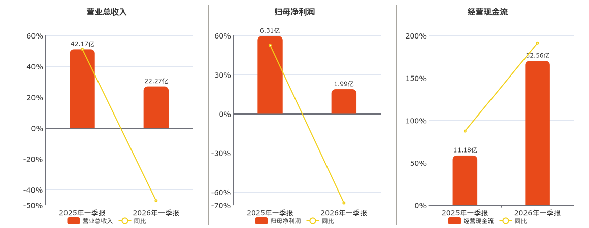 公司营业总收入为22.27亿元,较去年同报告期营业总收入减少19.90亿元,同比较去年同期下降47.20%。归母净利润为1.99亿元,较去年同报告期归母净利润减少4.31亿元,同比较去年同期下降68.41%。经营活动现金净流入为32.56亿元,较去年同报告期经营活动现金净流入增加21.38亿元,实现4年连续上涨,同比较去年同期上涨191.14%。