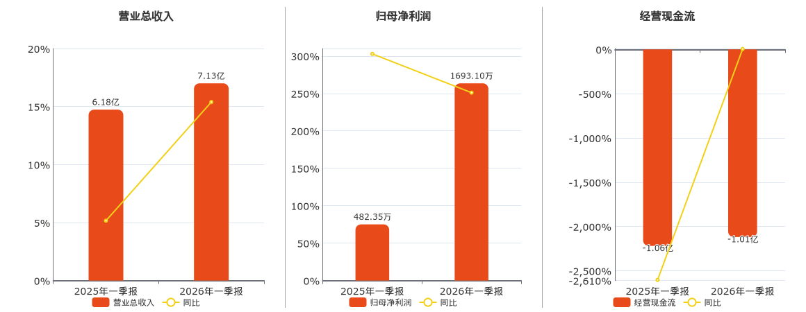 公司营业总收入为7.13亿元,较去年同报告期营业总收入增加9510.27万元,实现5年连续上涨,同比较去年同期上涨15.39%。归母净利润为1693.10万元,较去年同报告期归母净利润增加1210.75万元,实现4年连续上涨,同比较去年同期上涨251.01%。经营活动现金净流入为-1.01亿元,较去年同报告期经营活动现金净流入增加477.27万元。