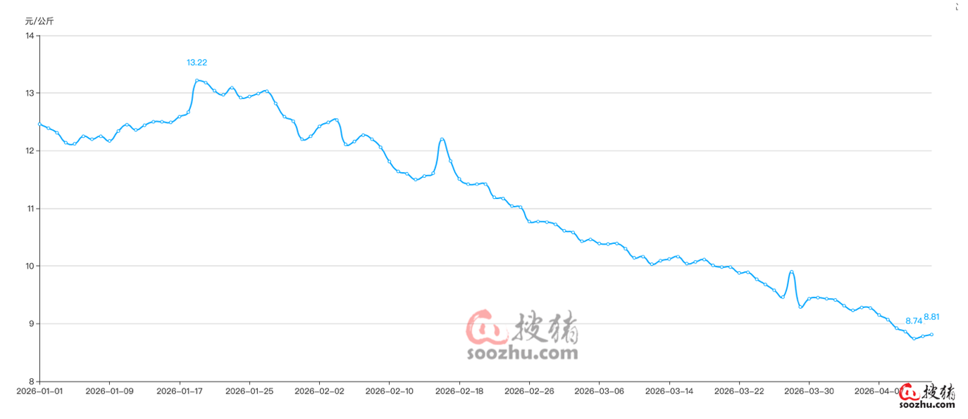 根据搜猪网数据,截至2026年3月末,全国外三元生猪出栏均价跌至8.74元/公斤,较2025年末下跌38.45%,较2025年同期的16.8元/公斤同比下跌47.98%,价格水平已回落至2018年非洲猪瘟前的周期底部区间,仅为2019年历史高点40.44元/公斤的21.6%。