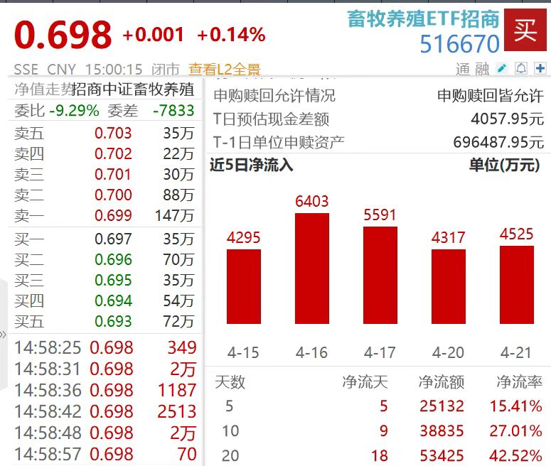 畜牧养殖ETF招商(516670)跟踪中证畜牧养殖指数,涵盖温氏股份、牧原股份、新希望等行业头部公司,其中与养猪直接相关的上市公司权重占比约60%。该ETF管理费为0.2%。