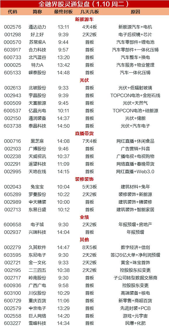 周一A股共36股涨停(不含ST股),8股封板未遂,连板股总数7只。个股方面,通达动力(轮边电机)4连板,好上好(电子后视镜)、二三四五(股权变更)、金一文化(黄金)、电子城(业绩)、东尼电子(业绩+大单)、罗曼股份(装修装饰+新能源)集体2连板。