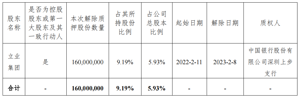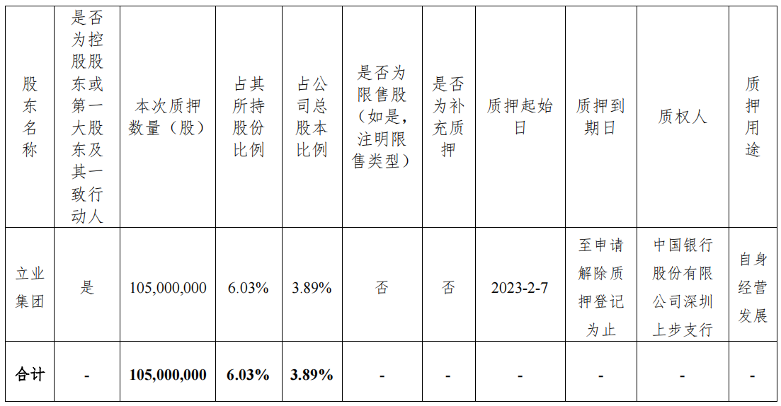 2023年2月9日,华林证券(002945.SZ)发布公告,近日,公司接到控股股东深圳市立业集团有限公司(以下简称“立业集团”)通知,知晓其所持有该公司的部分股份办理了质押及解除质押,具体事项如下: