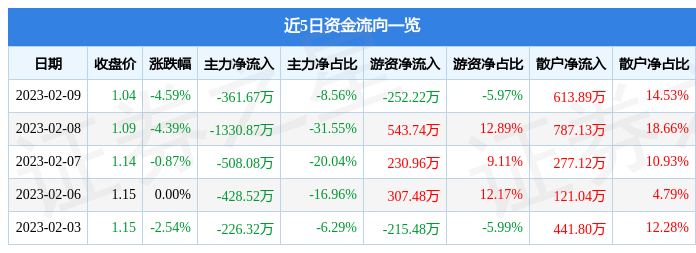 2月9日的资金流向数据方面,主力资金净流出361.67万元,占总成交额8.56%,游资资金净流出252.22万元,占总成交额5.97%,散户资金净流入613.89万元,占总成交额14.53%。