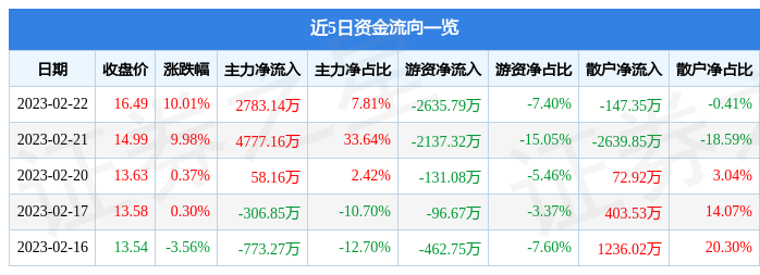 2月22日的资金流向数据方面,主力资金净流入2783.14万元,占总成交额7.81%,游资资金净流出2635.79万元,占总成交额7.4%,散户资金净流出147.35万元,占总成交额0.41%。