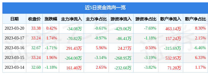 3月20日的资金流向数据方面,主力资金净流出34.08万元,占总成交额0.61%,游资资金净流出429.06万元,占总成交额7.69%,散户资金净流入463.14万元,占总成交额8.3%。