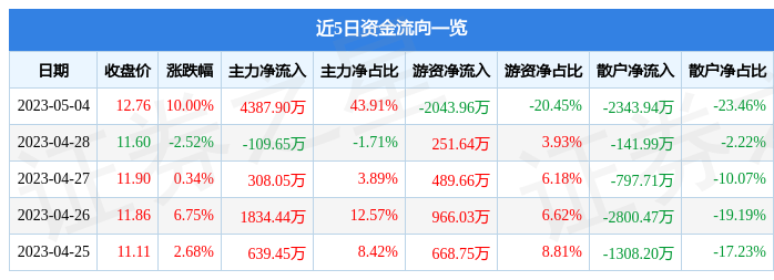 5月4日的资金流向数据方面,主力资金净流入4387.9万元,占总成交额43.91%,游资资金净流出2043.96万元,占总成交额20.45%,散户资金净流出2343.94万元,占总成交额23.46%。