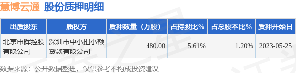 慧博云通(301316)5月26日公开信息显示,股东北京申晖控股有限公司向深圳市中小担小额贷款有限公司合计质押480.0万股,占总股本1.2%。质押详情见下表: