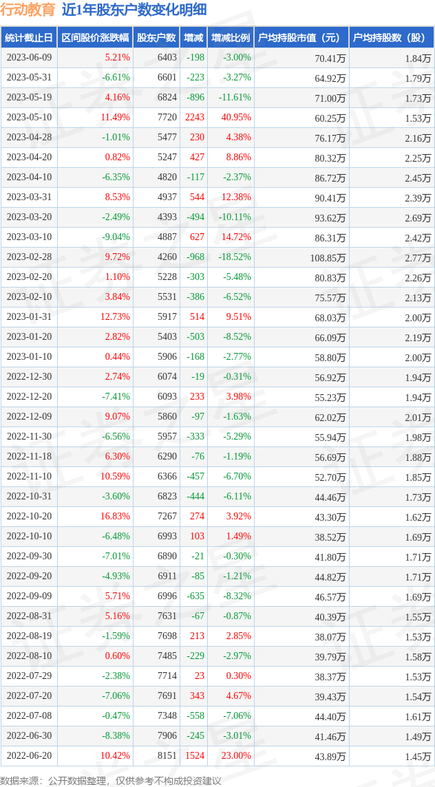 近日行动教育披露,截至2023年6月9日公司股东户数为6403.0户,较5月31日减少198.0户,减幅为3.0%。户均持股数量由上期的1.79万股增加至1.84万股,户均持股市值为70.41万元。