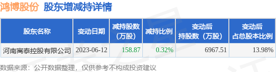 6月12日鸿博股份发布公告《鸿博股份:关于公司控股股东所持部分股份被强制平仓导致被动减持股份的公告》,其股东河南寓泰控股有限公司于2023年6月12日合计减持158.87万股,占公司目前总股本的0.3188%,变动期间该股股价上涨3.97%,截止6月12日收盘报39.51元。