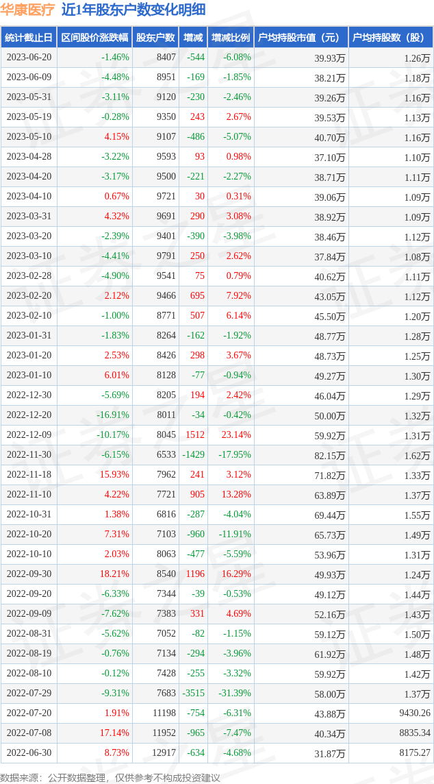 从股价来看,2023年6月9日至2023年6月20日,华康医疗区间跌幅为1.46%,在此期间股东户数减少544.0户,减幅为6.08%。