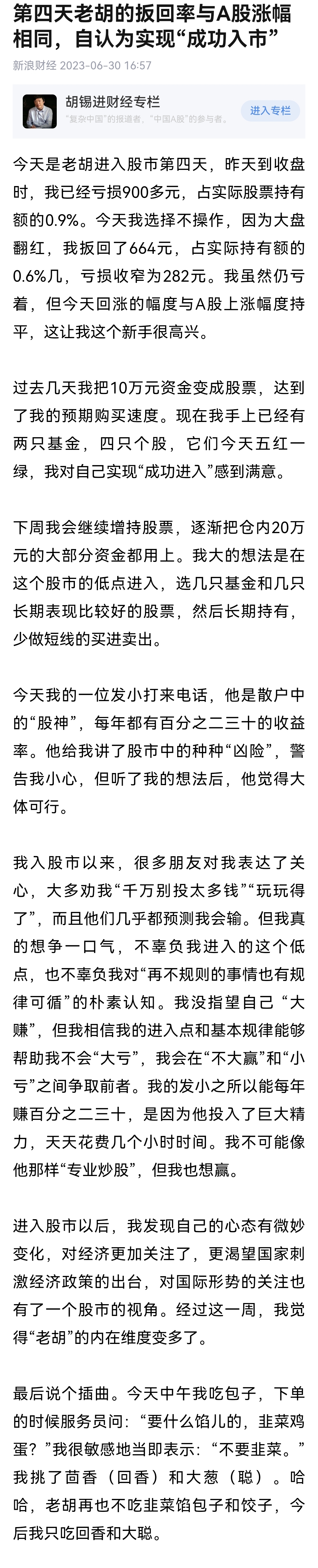 胡锡进表示,今天是自己进入股市第四天,昨天到收盘时,已经亏损900多元,占实际股票持有额的0.9%。