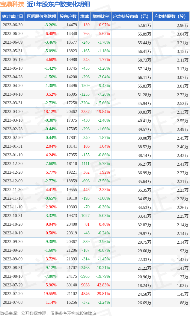 从股价来看,2023年6月20日至2023年6月30日,宝鼎科技区间跌幅为3.26%,在此期间股东户数增加139.0户,增幅为0.97%。
