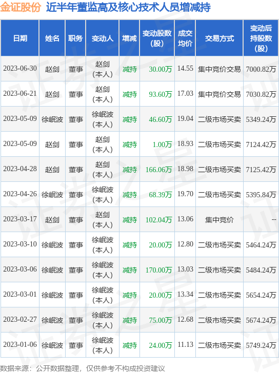 金证股份近半年内的董监高及核心技术人员增减持详情如下: