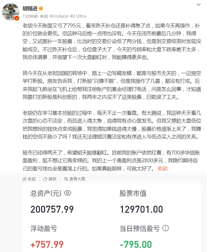 胡锡进还提到,今天闭市前最后几分钟,又试图补一支股票,不过胡设低了两分钱没能成交。胡锡进透露,昨天补仓后仓位盘子大了,今天亏损率和大盘下跌差不多。他表示总体满意,指望下一次大盘翻红时,能赚得更多些。