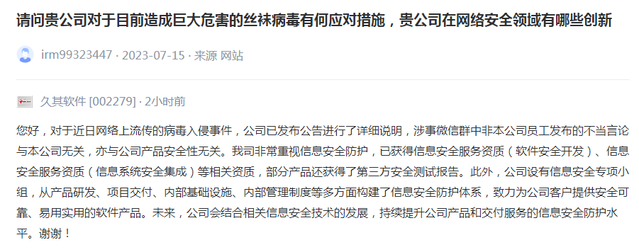 久其软件回答称,您好,对于近日网络上流传的病毒入侵事件,公司已发布公告进行了详细说明,涉事微信群中非本公司员工发布的不当言论与本公司无关,亦与公司产品安全性无关。我司非常重视信息安全防护,已获得信息安全服务资质(软件安全开发)、信息安全服务资质(信息系统安全集成)等相关资质,部分产品还获得了第三方安全测试报告。此外,公司设有信息安全专项小组,从产品研发、项目交付、内部基础设施、内部管理制度等多方面构建了信息安全防护体系,致力为公司客户提供安全可靠、易用实用的软件产品。未来,公司会结合相关信息安全技术的发展,持续提升公司产品和交付服务的信息安全防护水平。谢谢!