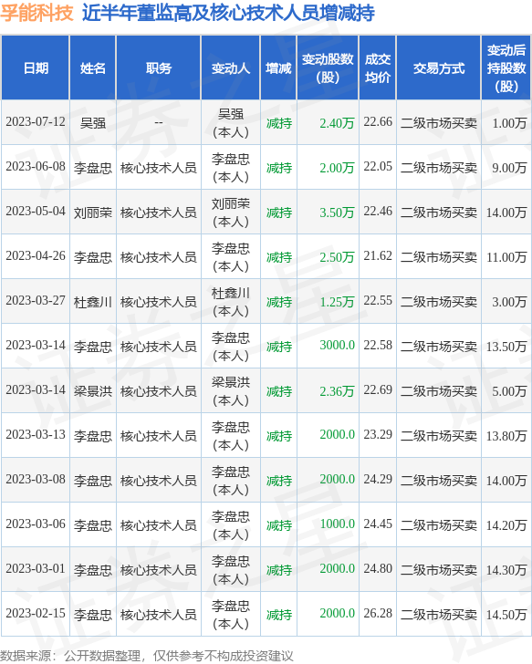 孚能科技近半年内的董监高及核心技术人员增减持详情如下: