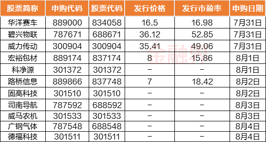 本周(7月31日-8月4日)A股市场共11只新股发行,其中创业板5只,科创板3只,北交所3只。具体安排如下,周一3只:华洋赛车(北交所)、碧兴物联(科创板)、威力传动(创业板);周二2只,宏裕包材(北交所)、科净源(创业板);周三2只:路桥信息(北交所)、固高科技(创业板);周四2只:司南导航(科创板)、威马农机(创业板);周五2只:广钢气体(科创板)、福德科技(创业板),上述公司股票的申购将在本周陆续开放。