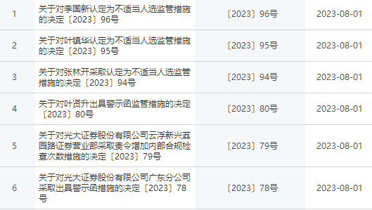 8月1日,广东证监局公告,对光大证券广东分公司出具警示函,对光大证券云浮新兴荔园路证券营业部责令增加内部合规检查次数,并对4名员工分别出具监管措施。