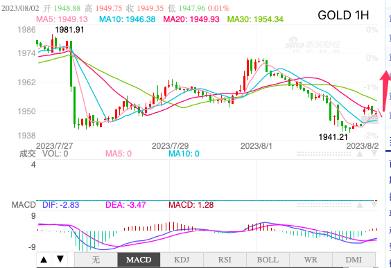黄金短线(1H)走势整体震荡下行且创新低1941附近,收复前一个交易日涨幅。今日早盘金价小幅跳空反弹,对前期跌势起到止步作用。从MACD指标看出现底背离,预示空头动能有减弱迹象。预计日内黄金仍在短线区间内盘整,反弹向上测试区间上沿。