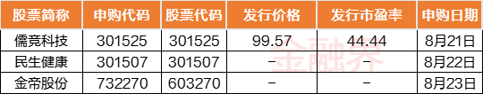 本周(8月21日-8月25日)A股市场仅3只新股发行,其中沪市主板1只,创业板2只。具体安排如下,周一1只:儒竞科技(创业板);周二1只,民生健康(创业板),周三1只:金帝股份,上述公司股票的申购将在本周陆续开放。