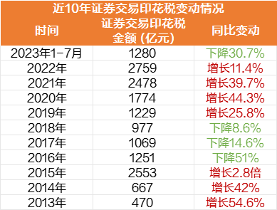 梳理发现,近10年证券交易印花税超过2000亿的有3个年份,分别是2022年的2759亿、2021年的2478亿、2015年的2553亿,低于1000亿的也有3个年份,分别是2013年的470亿、2014年的667亿、2018年的977亿。