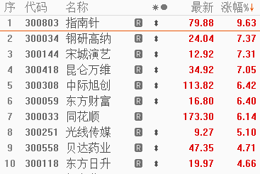 创业板成分股中,指南针涨超9%,早盘曾一度“20CM”涨停,宋城演艺、钢研高纳等涨超7%。